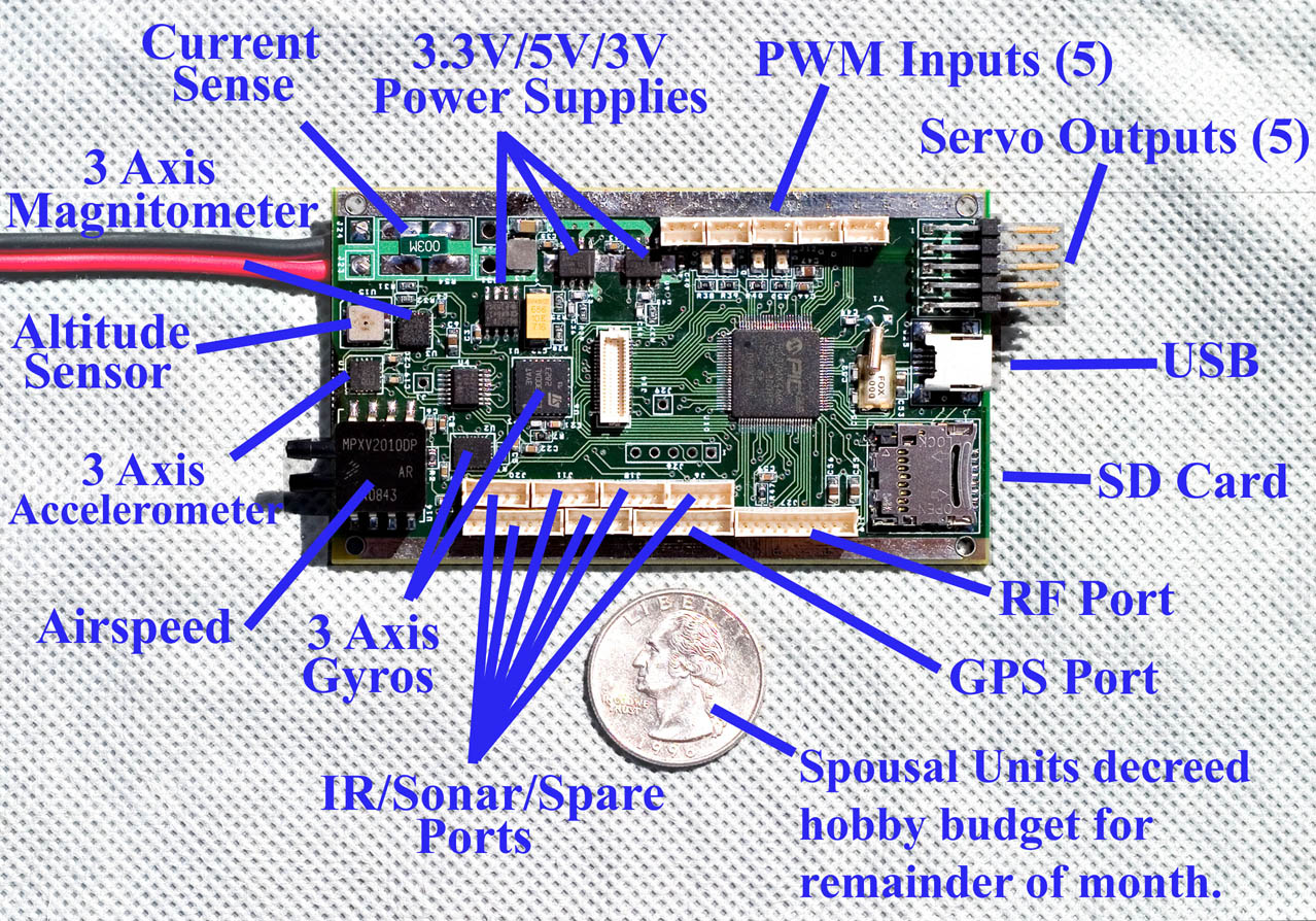 3 Axis Gyro 3 Axis Accelerometer 3 Axis Magnetometer Barometer Airspeed Sensor 5 PWM Inputs 5 PWM Output 50A Current Sense 3.3V Regulator @ 3Amps 5.0V Regulator @ 3Amps uSD Card USB Port Telemetry Interface (async serial) GPS Interface (async serial) Spare discrete, analog and serial IO . |